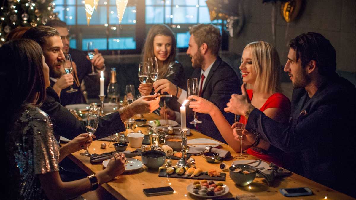 The evening begins with live music and jazz at sunset, creating a warm and sophisticated atmosphere as the sky transforms into a canvas of golden hues 🎷🌅. Guests are then guided through a culinary journey with a five-course dinner, carefully crafted to reflect the essence of coastal flavors and festive indulgence 🍽️🍾. Every bite is paired thoughtfully with beverages to complement the elegant menu.